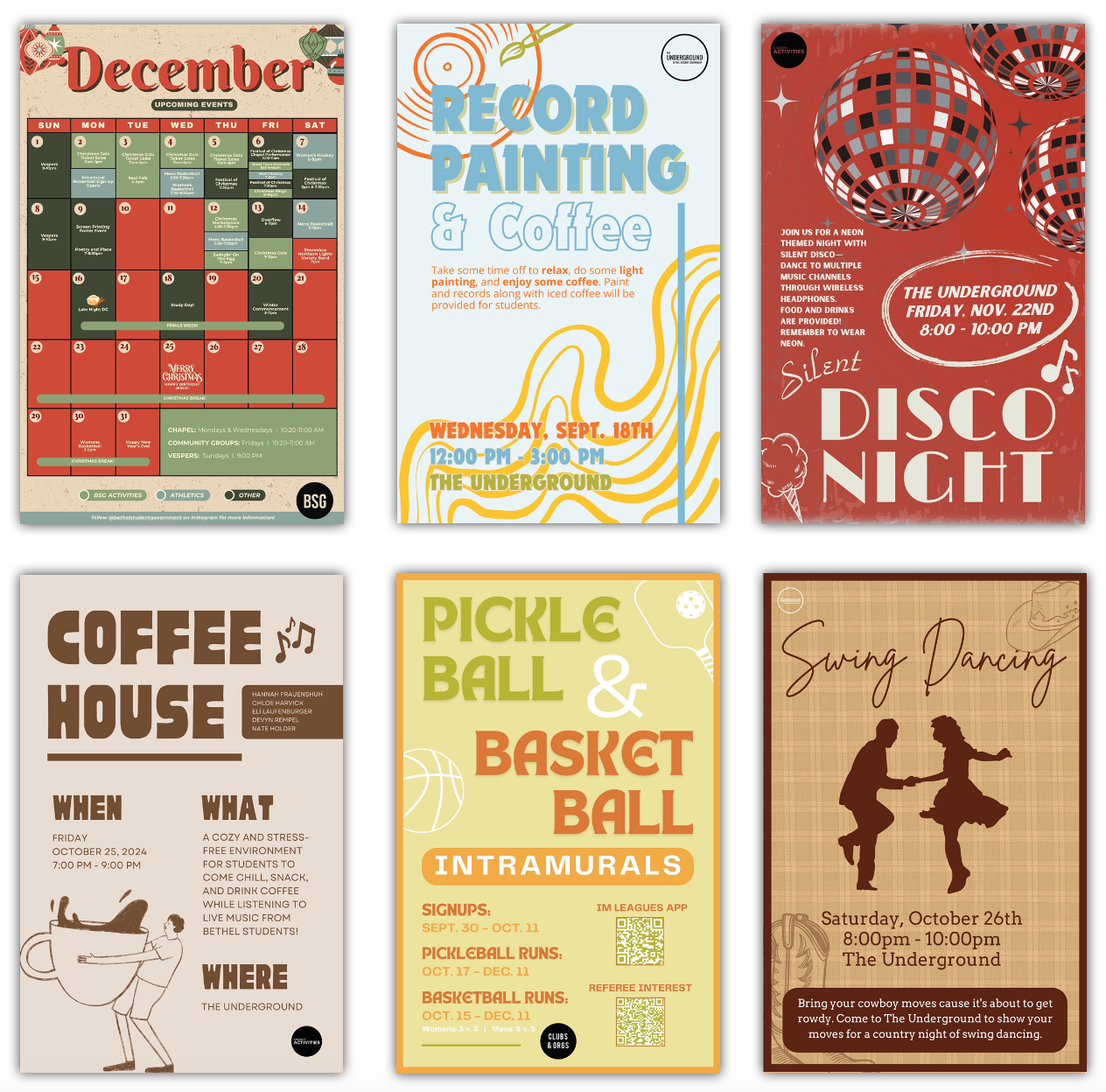 As The Director of Graphic Design for Bethel Student Government, I create posters that are hung up around the college to promote events happening on campus to the student body. For this client, I am restricted to using Canva so that others can have access to the posters. After being assigned an event, I receive information about the event's details and what the client would like included on the poster. This is work done with quick deadlines and multiple overseers.